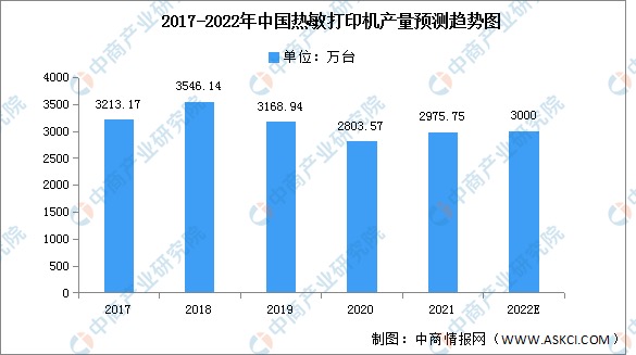 热敏打印机在我国各行各业中的运用越来越广泛,尤其近年来我国电子商务的快速兴起,带动了热敏打印行业的蓬勃发展。2021年我国热敏打印机产量为2975.75万台,同比增长6.14%,预计2022年将增长至3000万台。