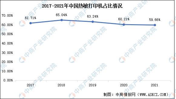 近年来,中国热敏打印机产量占全国打印机产量的比重一直保持在60%上下波动,2021年我国热敏打印机产量占全国打印机产量的59.66%。